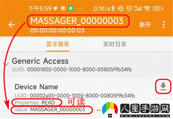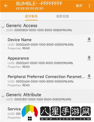 4、比如服務(wù)Generic Access里面有個(gè)特性是Device Name 設(shè)備名,屬性Properties為Read可讀,界面有個(gè)向下的箭頭代表download,點(diǎn)擊就能讀出Value,和最上面的藍(lán)牙名稱是一致的;