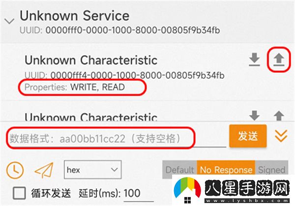 5、對(duì)于屬性Properties為Write可寫的特性,點(diǎn)擊向上的箭頭upload可對(duì)此Characteristic進(jìn)行寫數(shù)據(jù),然后點(diǎn)擊發(fā)送;