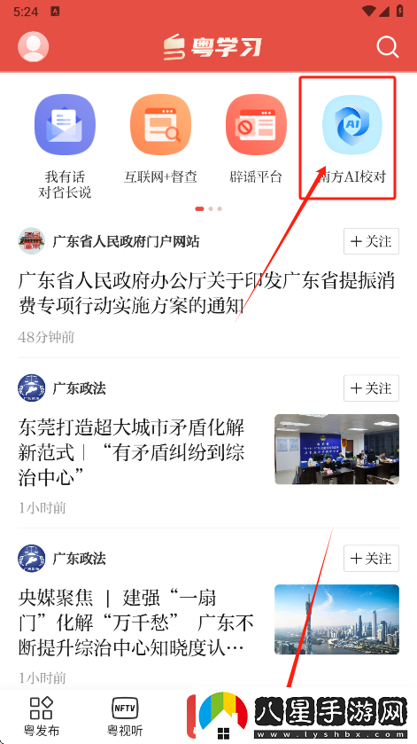 1、在底部導(dǎo)航欄切換到粵政通,然后在上方找到南方AI校對,如圖所示