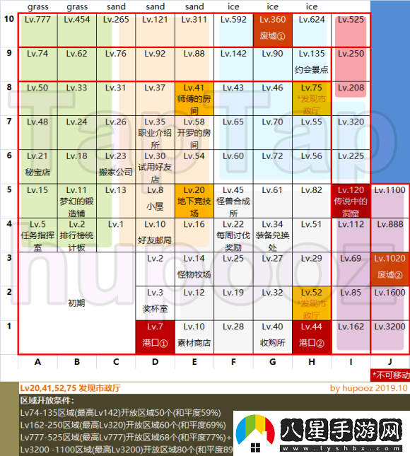 綠色為草地區(qū)/橙色為沙漠區(qū)/藍(lán)白色為雪地區(qū)/粉色為火山區(qū)/白色為巖石區(qū)/紫色為沼澤區(qū)