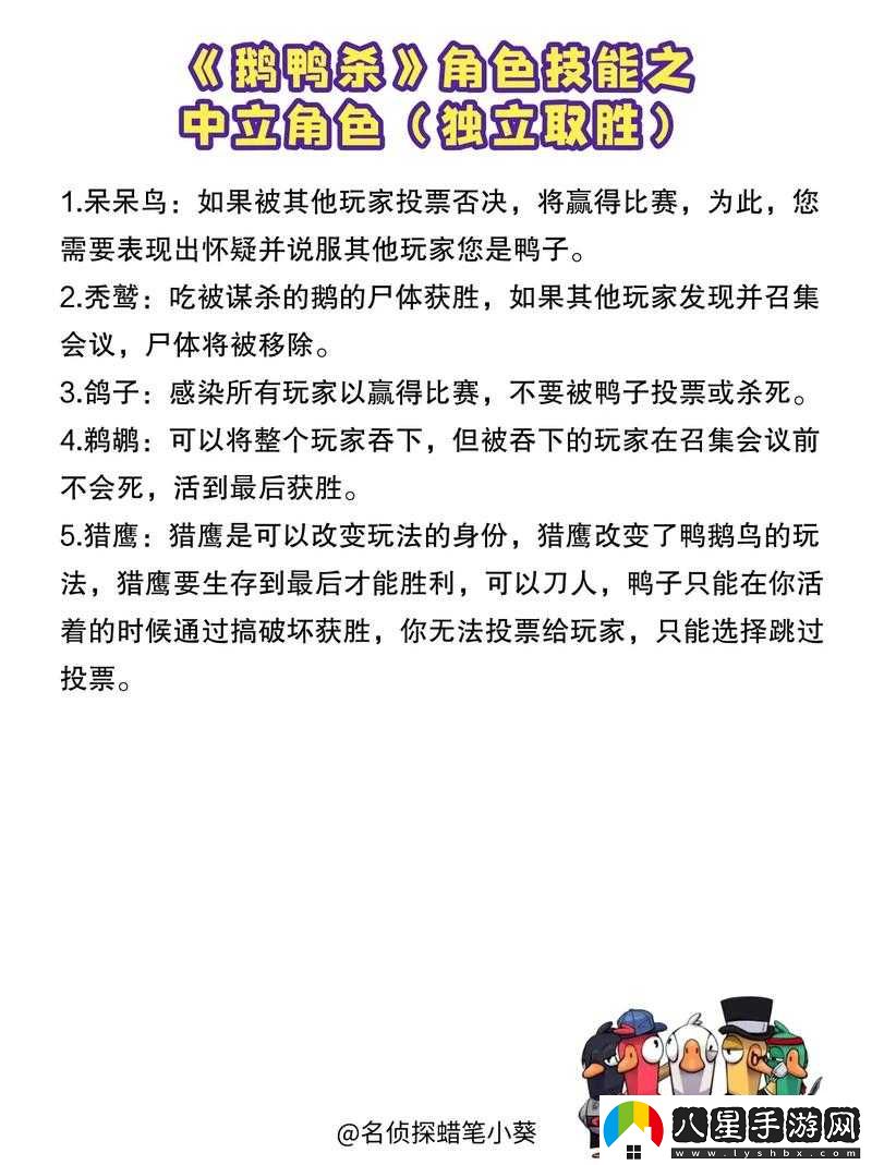 在鵝鴨殺這個(gè)充滿神秘與未知的游戲世界里,追蹤狂鵝是個(gè)獨(dú)特的角色。他擁有種特殊的能力,那就是能夠追蹤并揭示鴨子的行蹤。他不僅是位出色的偵探,也是位可靠的隊(duì)友,他的存在為鵝方提供了強(qiáng)大的支持。
