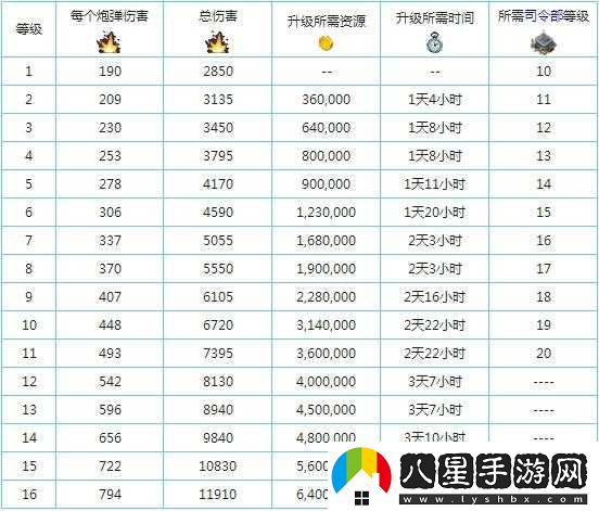 為了更直觀地展示巨型加農(nóng)炮升級的具體情況,以下是一個大致的升級數(shù)據(jù)表: