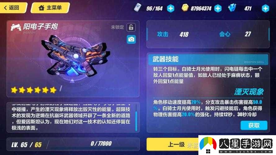 1. 超電磁炮:普通攻擊有 30%概率觸發(fā)超電磁炮,對目標造成 400%攻擊力的傷害。這個技能使超電磁手炮在攻擊時有一定幾率造成高額傷害,特別適合對付單個強大的敵人。